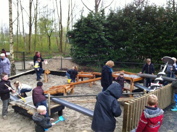 In 2012 is, dankzij sponsors, de grote water/zandspeelhoek gebouwd en geopend. De speelhoek kwam op de plaats van de oude zandbak. De combinatie van water, zand, een pomp, een vijzel en allerlei watergoten maakt de hoek tot een uitdagende attractie voor jong en oud. Vaak zien we dat ouders met hun kinderen actief meedoen in deze hoek. Om vervuiling door bijvoorbeeld bladeren te voorkomen, is er een afdekzeil gemaakt.